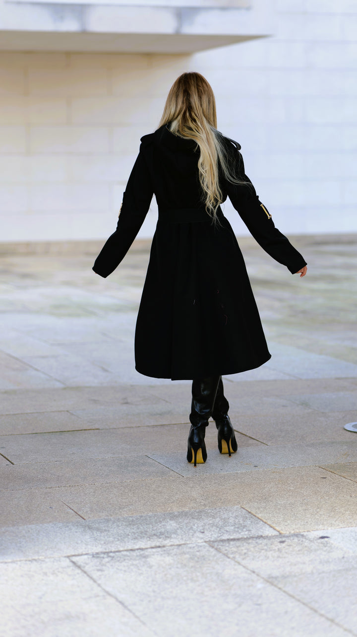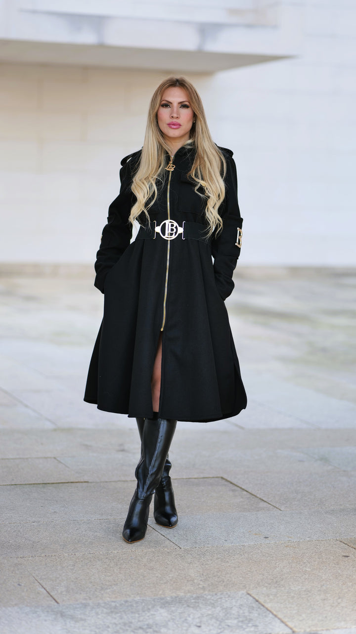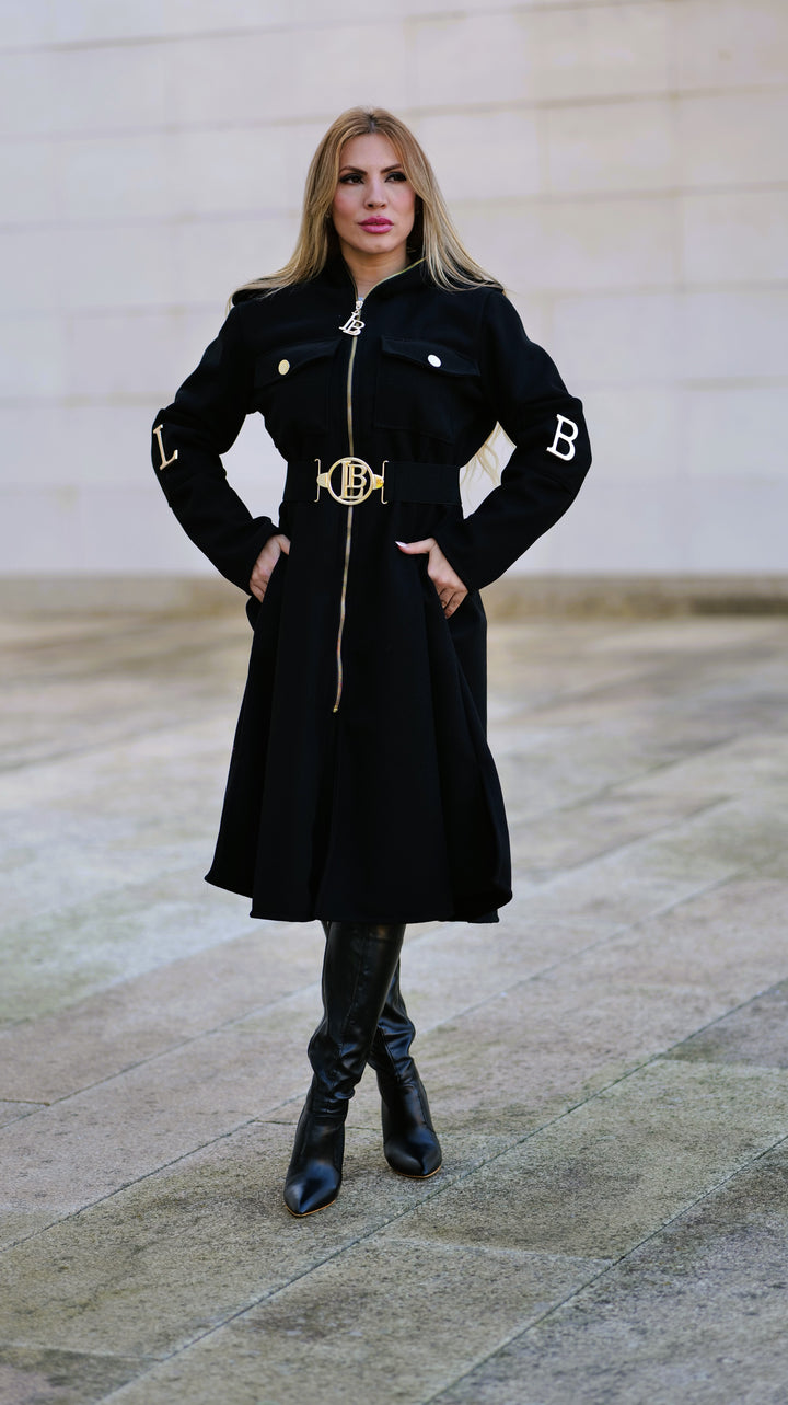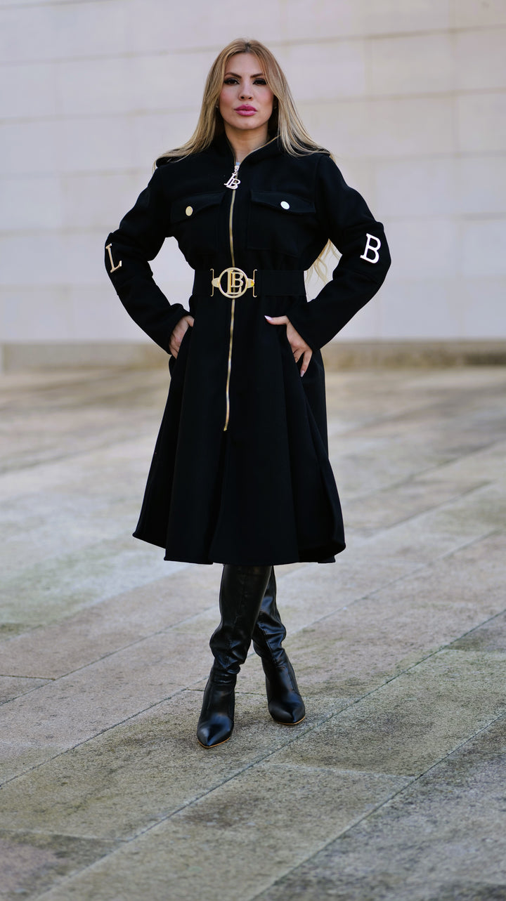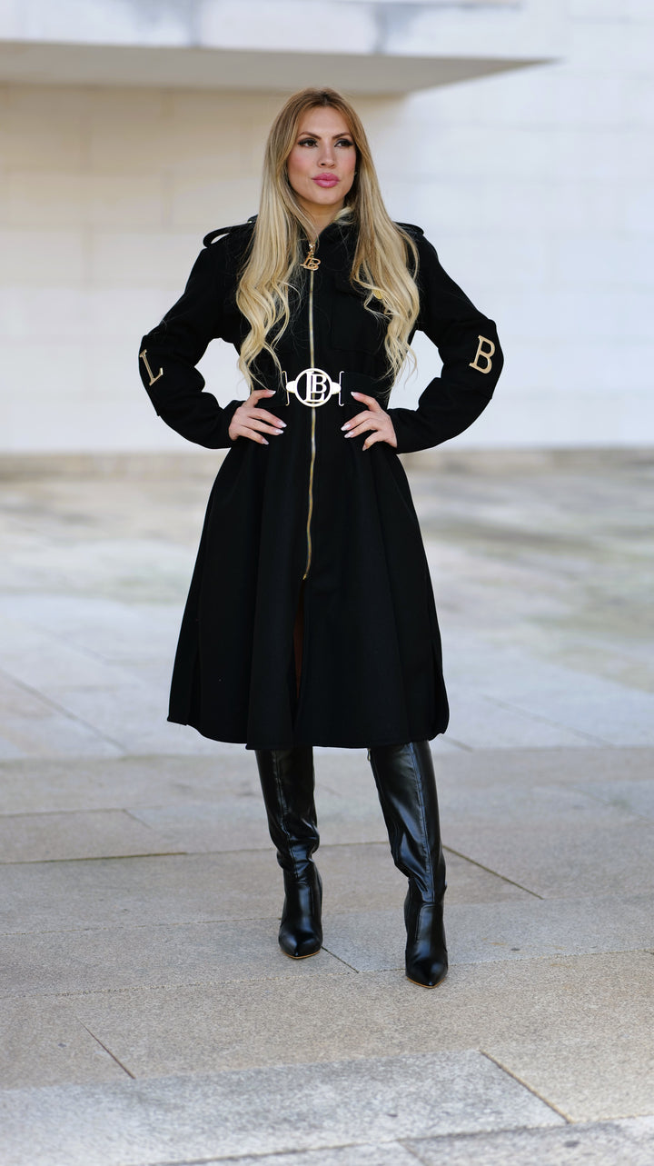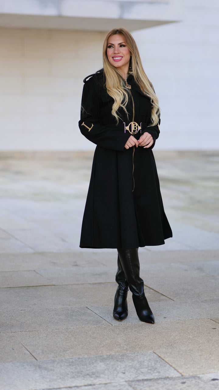 Este casaco elegante é confeccionado em poliéster com efeito fazenda , oferecendo um visual sofisticado e ideal para a meia estação . Conta com bolsos frontais para praticidade e botões laterais nas mangas com as letras da marca em peças metálicas douradas , adicionando um toque exclusivo e refinado. O cinto incluído permite um ajuste perfeito, destacando a silhueta. Perfeito para quem procura estilo e conforto em uma única peça versátil e que poderá usar todo o ano.