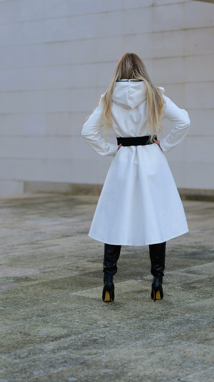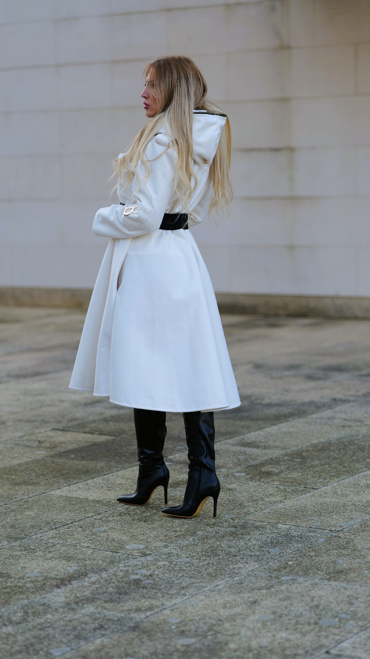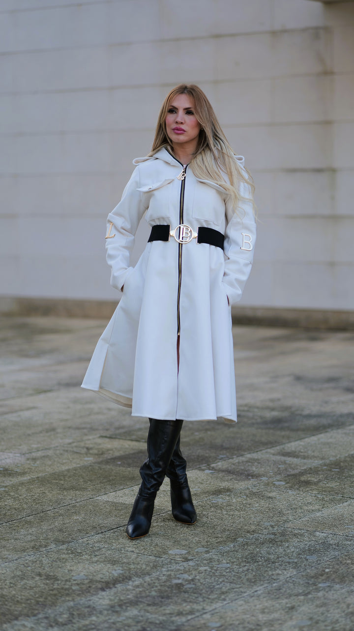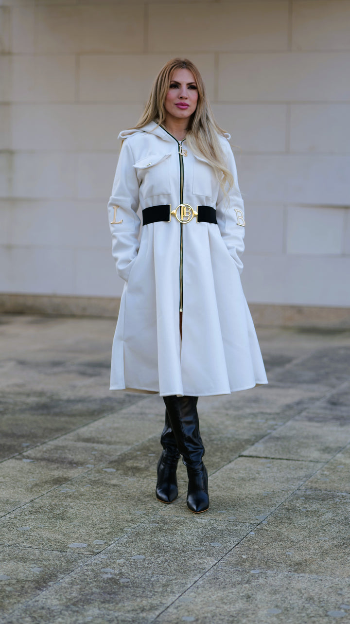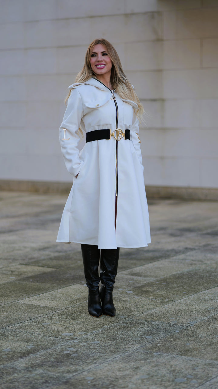 Este casaco elegante é confeccionado em poliéster com efeito fazenda , oferecendo um visual sofisticado e ideal para a meia estação . Conta com bolsos frontais para praticidade e botões laterais nas mangas com as letras da marca em peças metálicas douradas , adicionando um toque exclusivo e refinado. O cinto incluído permite um ajuste perfeito, destacando a silhueta. Perfeito para quem procura estilo e conforto em uma única peça versátil e que poderá usar todo o ano.