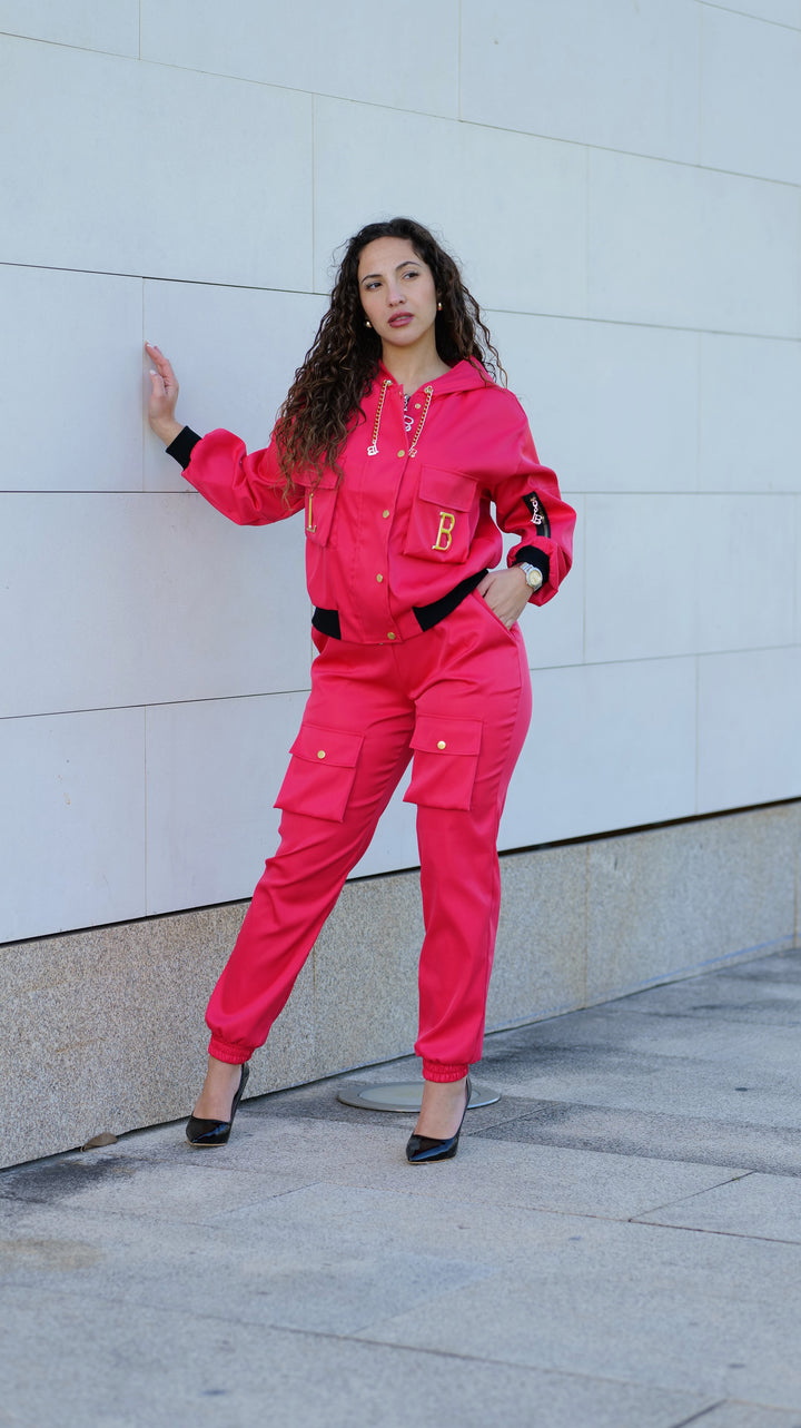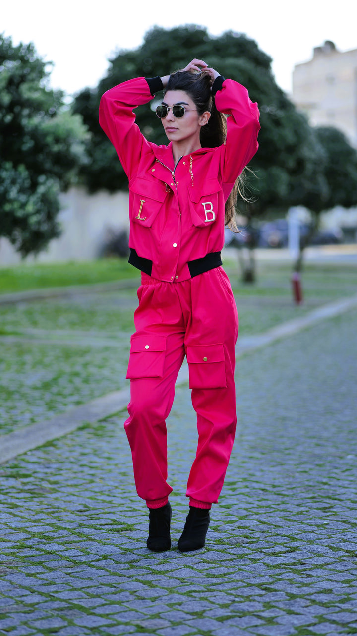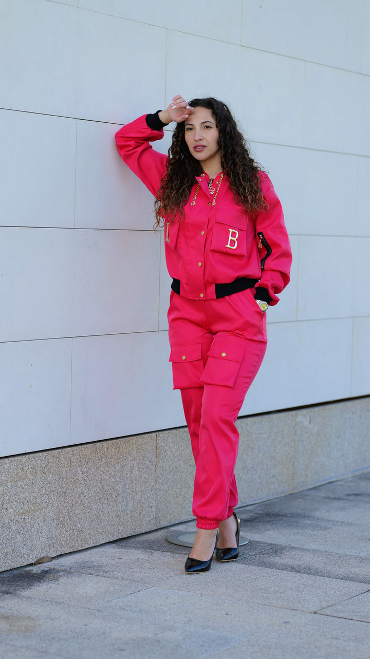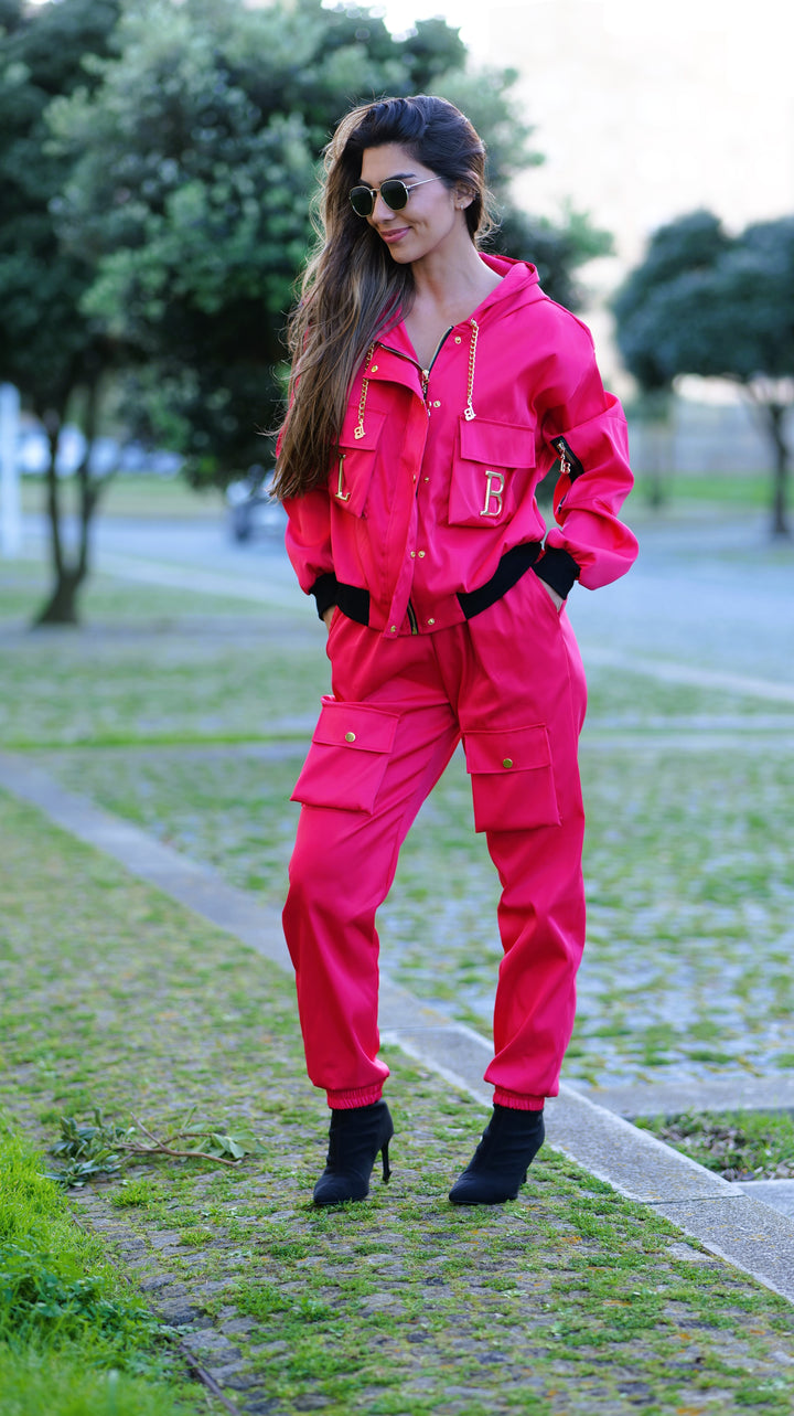 A calça cargo acrescenta um toque moderno e urbano ao look, com bolsas laterais funcionais , um detalhe que está em grande destaque nesta estação. O casaco elegante se destaca pelos acessórios metálicos dourados amovíveis com as letras da marca , proporcionando um acabamento sofisticado e exclusivo.