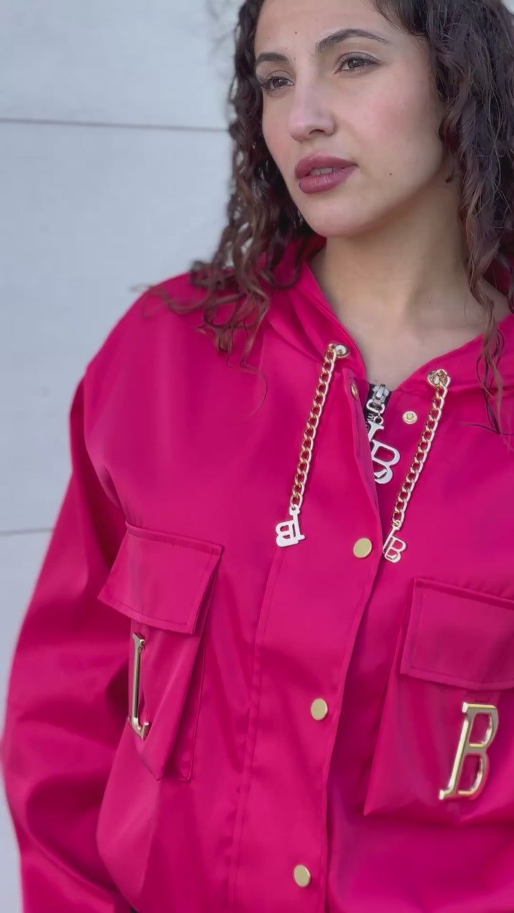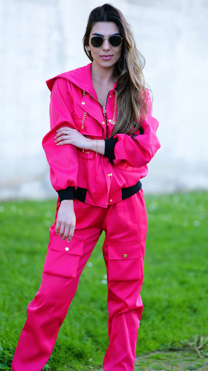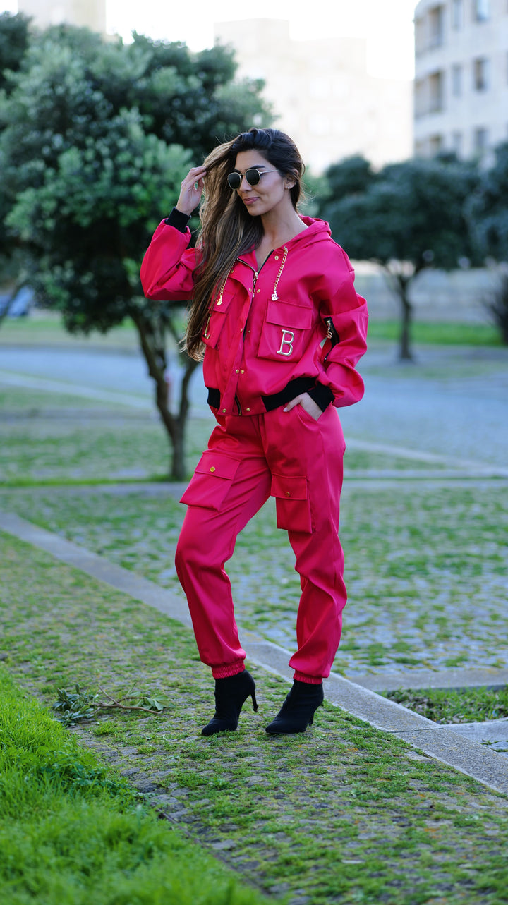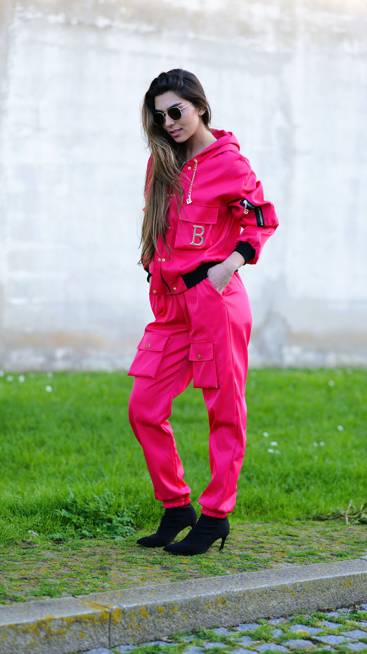 A calça cargo acrescenta um toque moderno e urbano ao look, com bolsas laterais funcionais , um detalhe que está em grande destaque nesta estação. O casaco elegante se destaca pelos acessórios metálicos dourados amovíveis com as letras da marca , proporcionando um acabamento sofisticado e exclusivo.