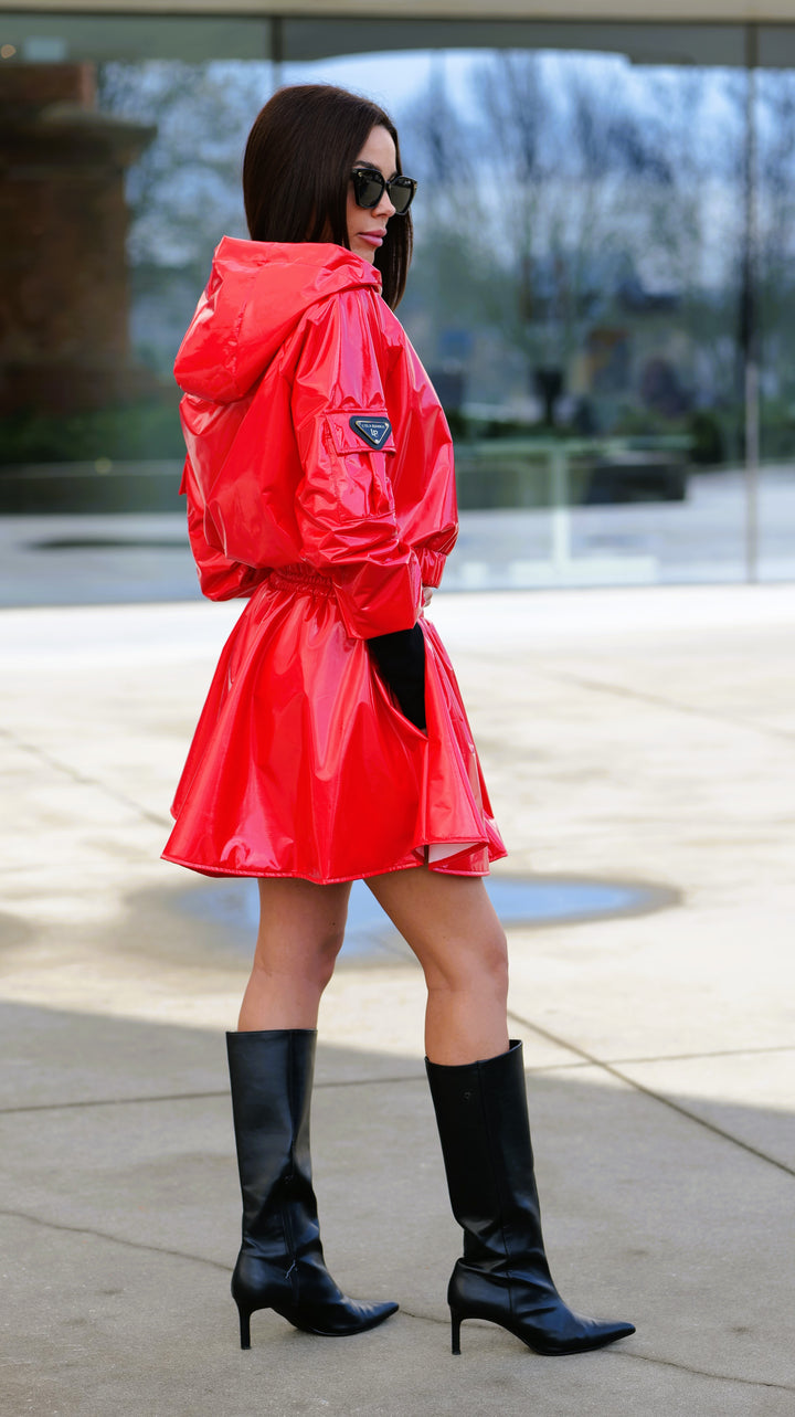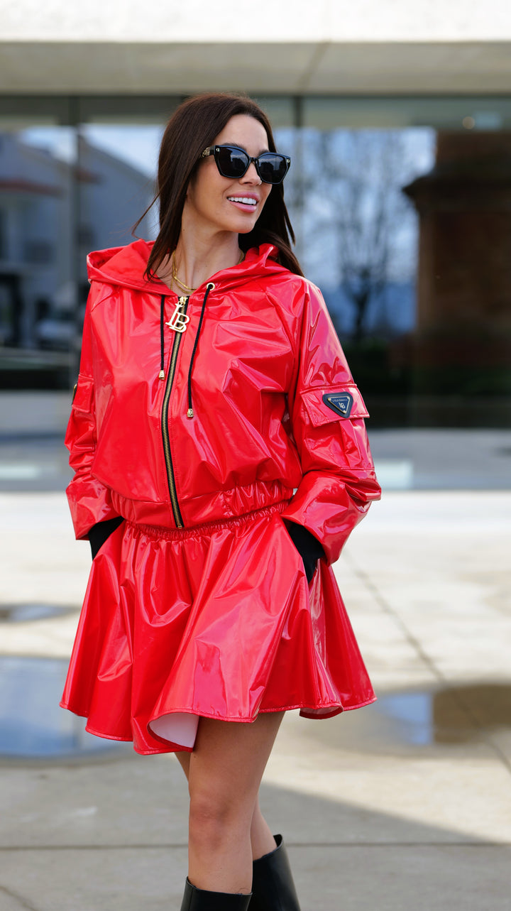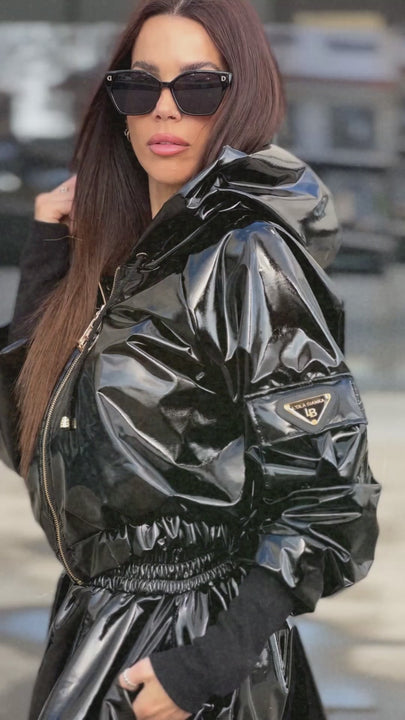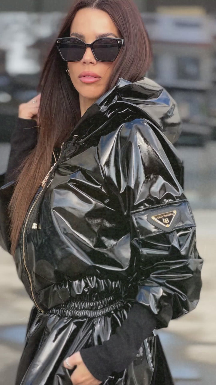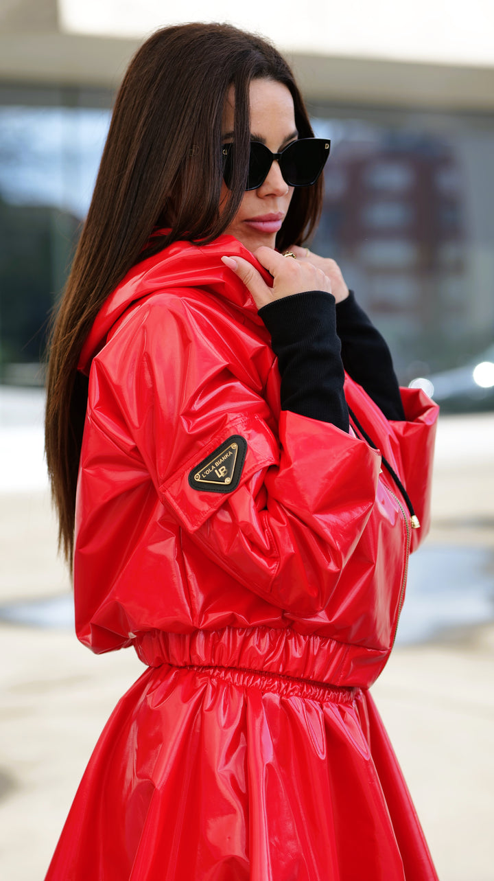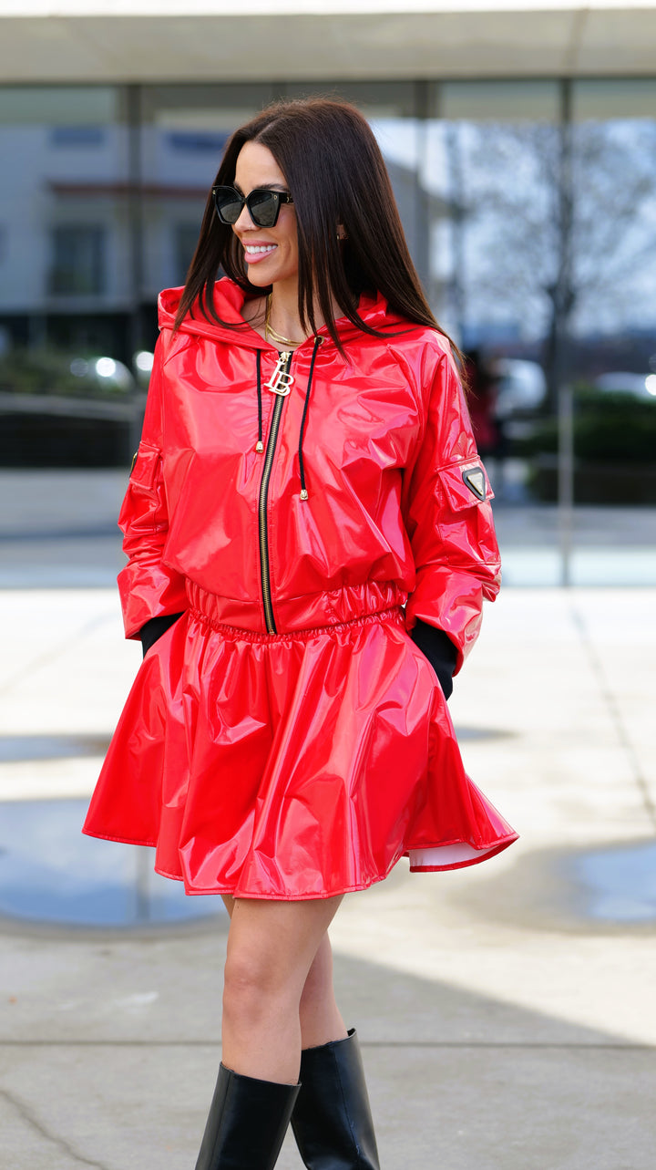 Este conjunto moderno e sofisticado combina um casaco estruturado e um calção com efeito saia , criando um visual elegante e inovador. Feito em material vinil , proporciona um brilho sofisticado e um toque fashion. O fecho personalizado adiciona um detalhe exclusivo, reforçando o estilo único do conjunto. Ideal para quem procura um look prático, marcante e cheio de personalidade.