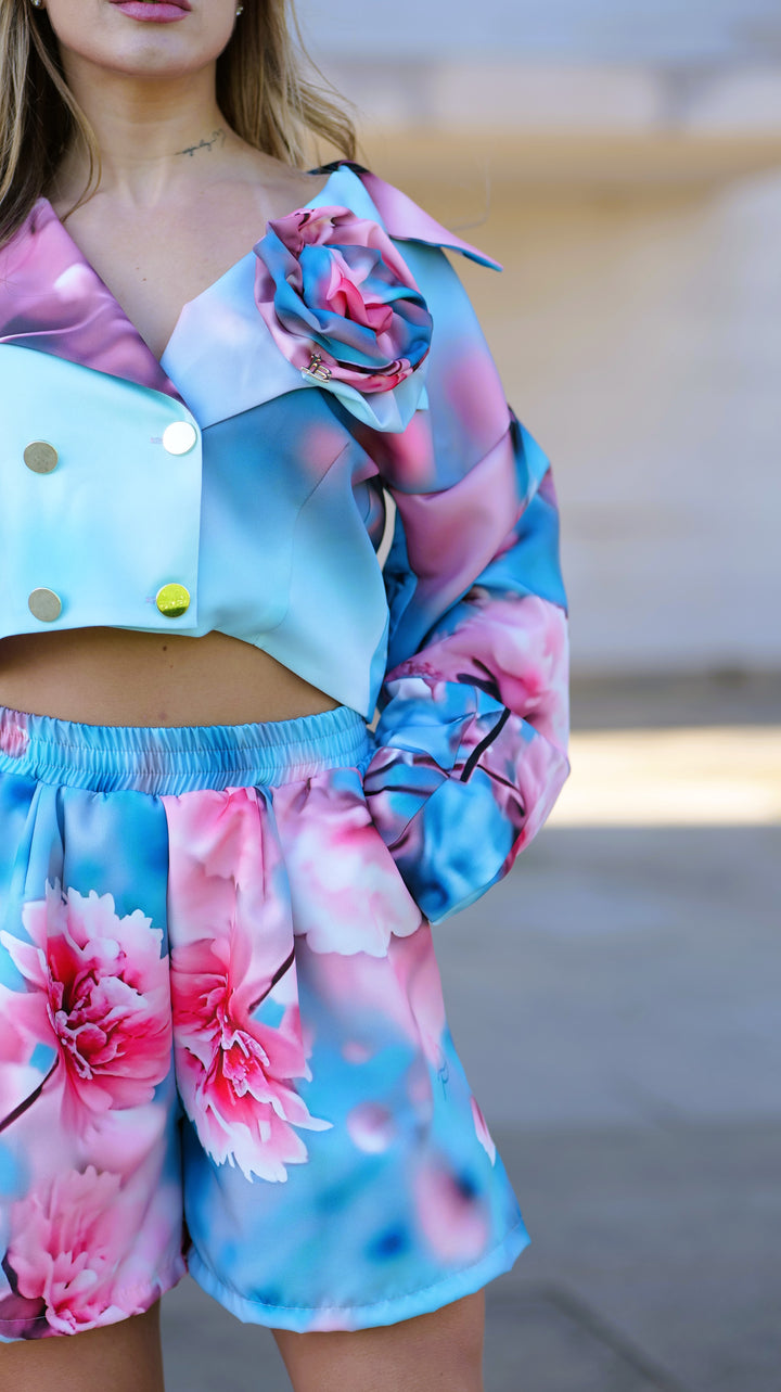🔸 Blazer estilo curto com padrão floral delicado, transmitindo toda a leveza e frescor da primavera/verão. A flor amovível na lapela adiciona um detalhe único e personalizado, permitindo criar diferentes estilos.