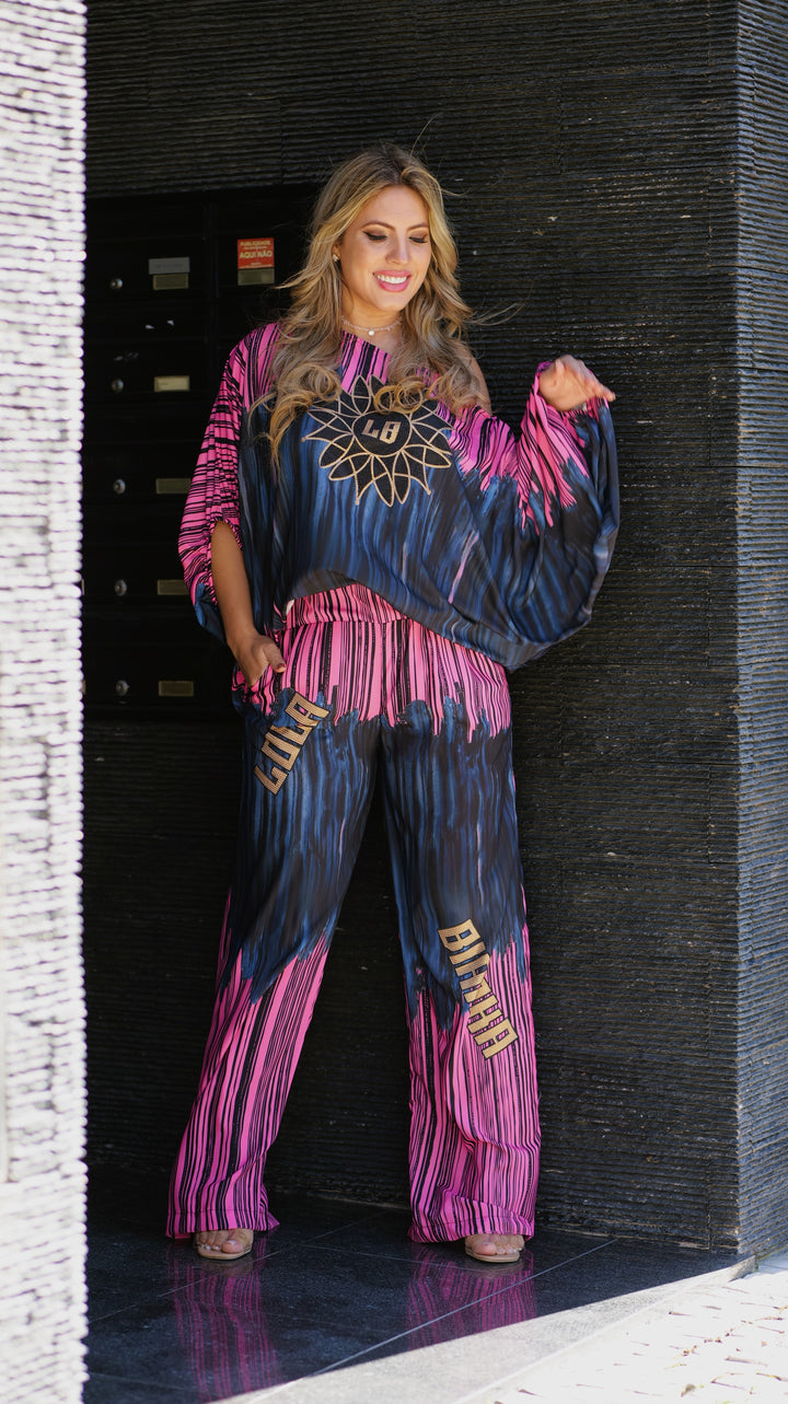 Conjunto de camisola e calça pantalona com padrão exclusivo L'Ola Bianka. De estilo oversize, esta peça é perfeita para a Primavera-Verão, proporcionando um look moderno, leve e sofisticado.
