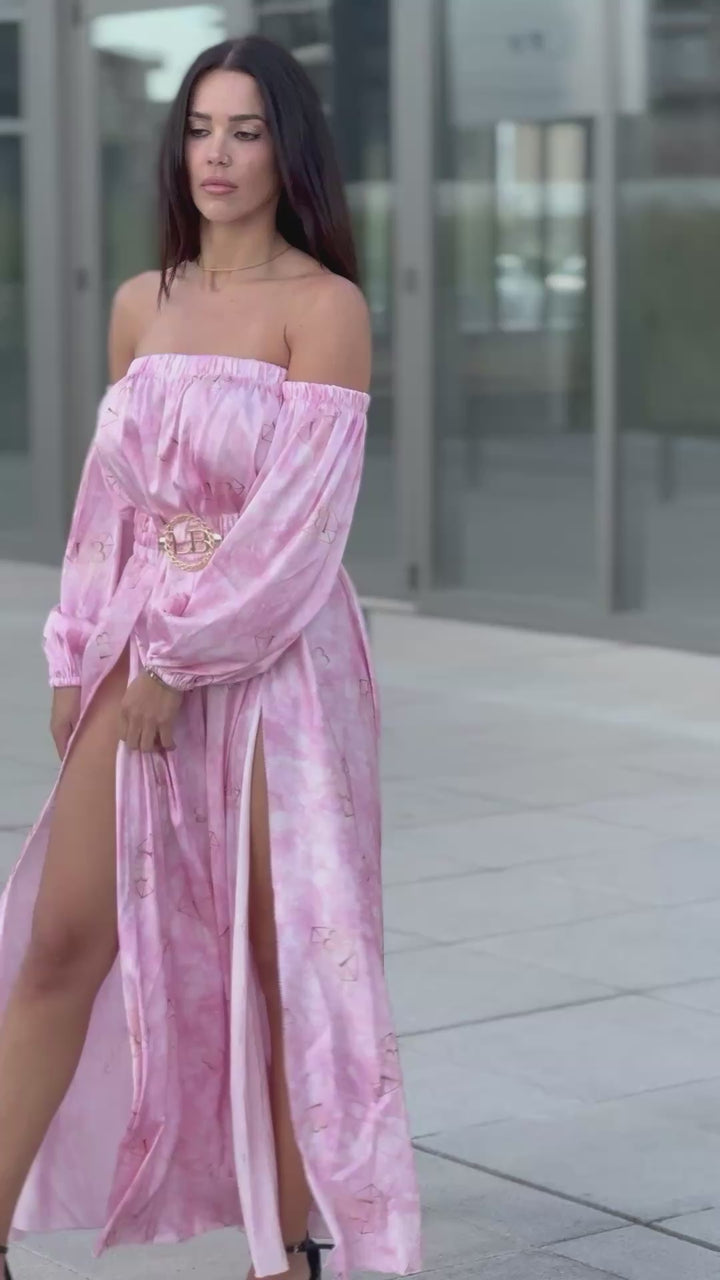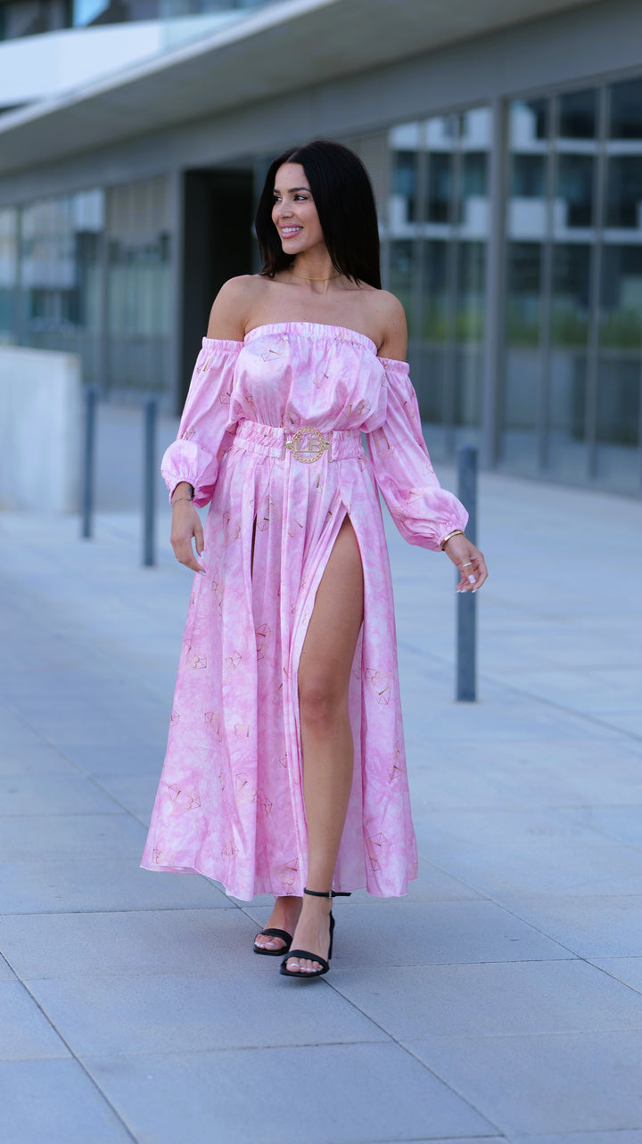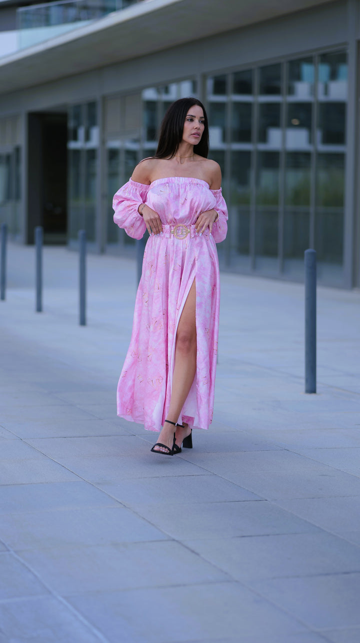 Destaque-se com o seu design versátil, que inclui um cinto com a logomarca em dourado, realçando a silhueta com um toque de requinte. As mangas com efeito de ombro à mostra e a gola estilo barco acrescentam um charme romântico e delicado, tornando este vestido uma peça irresistível.