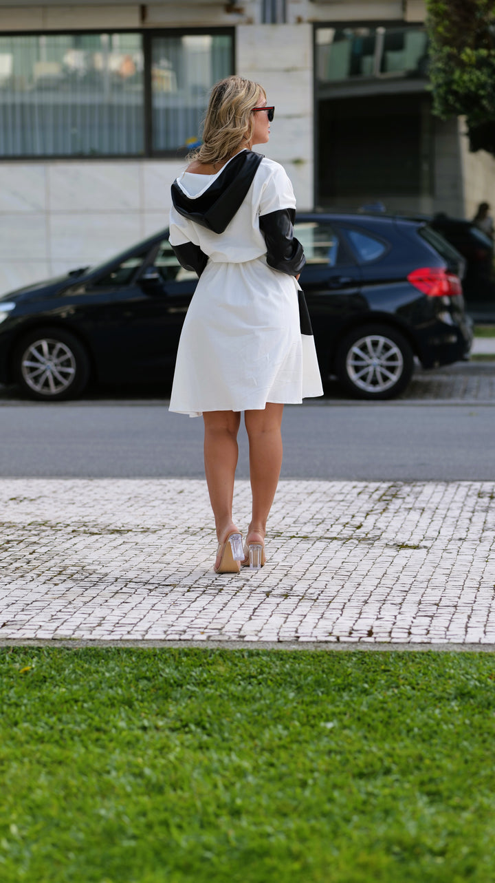 Este vestido em algodão é a escolha perfeita para quem procura conforto e estilo com um toque moderno. O cordão de ajuste na cintura permite personalizar o caimento, destacando a silhueta de maneira elegante. As mangas em ecopelle adicionam um contraste arrojado e sofisticado ao design. Versátil e ideal para diversas graças, este vestido combina os detalhes do algodão com a modernidade dos detalhes em ecopelle, criando um visual único e cheio de personalidade.