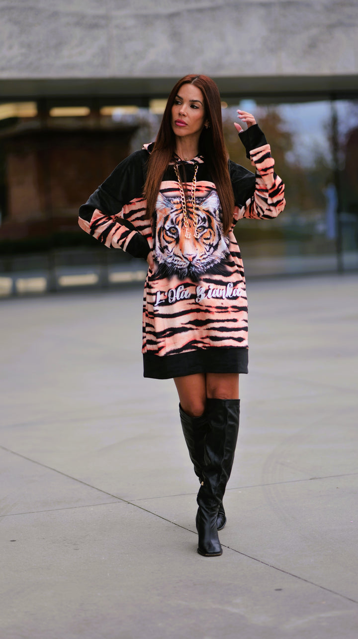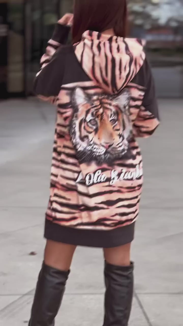 Destaque-se com este vestido sofisticado em veludo suave, que combina conforto e ousadia em uma peça única. O vibrante padrão de tigre adiciona um toque selvagem e moderno, ideal para quem quer marcar presença com estilo. Com o caimento perfeito e o toque macio do veludo. Combine com acessórios neutros para deixar o padrão brilhar ou ousar ainda mais com detalhes chamativos!